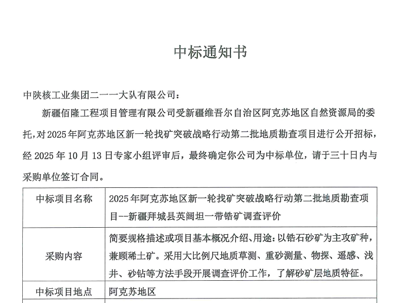 10月15日,從新疆政府采購網(wǎng)傳來振奮人心的捷報(bào),二一一隊(duì)成功中標(biāo)2025年阿克蘇地區(qū)新一輪找礦突破戰(zhàn)略行動(dòng)第二批地質(zhì)勘查項(xiàng)目——“新疆拜城縣英闊坦一帶鋯礦調(diào)查評(píng)價(jià)”項(xiàng)目。對(duì)公司而言,鋯礦調(diào)查評(píng)價(jià)是一個(gè)相對(duì)嶄新的領(lǐng)域,此次中標(biāo)為公司在拓展戰(zhàn)略新興資源地質(zhì)勘查市場(chǎng)寫下了濃墨重彩的一筆。