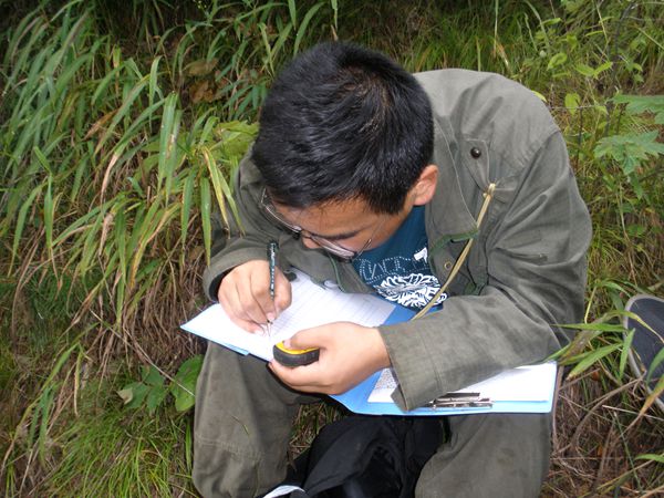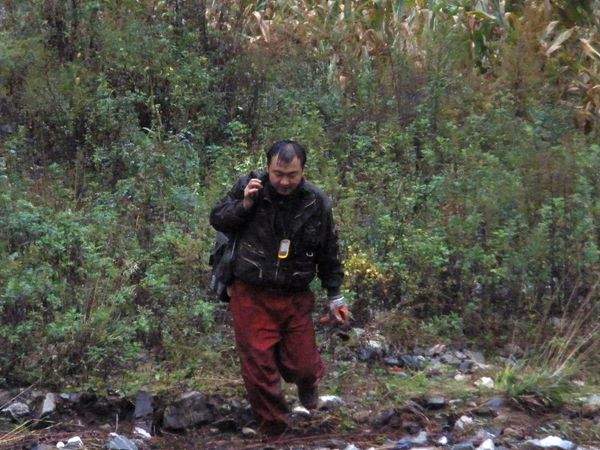 由于工作區(qū)大部分位于秦嶺的密林區(qū),常有野生動物和毒蛇出沒。俗話說“山豬狗,比虎兇”,為了防身,木棍和鐮刀兩件寶必不可少。木棍主要是探路用,趕散山豬和蛇之類的動物,鐮刀則主要用來割草、砍樹枝,為腳板開道。古人云“明槍易躲,暗箭難防”,所以最可怕的莫過于那些隱藏在土里和腐朽的木樁里的土蜂,稍不注意便打擾了它們的正常生活,那后果不堪設(shè)想。有好幾位同事曾被它們的毒刺所傷,然而在手依然浮腫的情況下仍然認真的記錄著,所以野外采樣時,還得時不時地左顧右盼。有時看似晴天,但突然一陣寒風(fēng)襲來,遙望天際,烏云早已集結(jié)完畢,一場不可避免的大雨傾盆而下,在山上連躲雨的地方也沒有,遭雨淋是家常便飯。我們在崎嶇的山路上走走停停,衣服已被浸濕,而此時已分不清汗水和雨水,只能看清GPS顯示的采樣點和手里羅盤所指的方位,朝著那里繼續(xù)前進......。