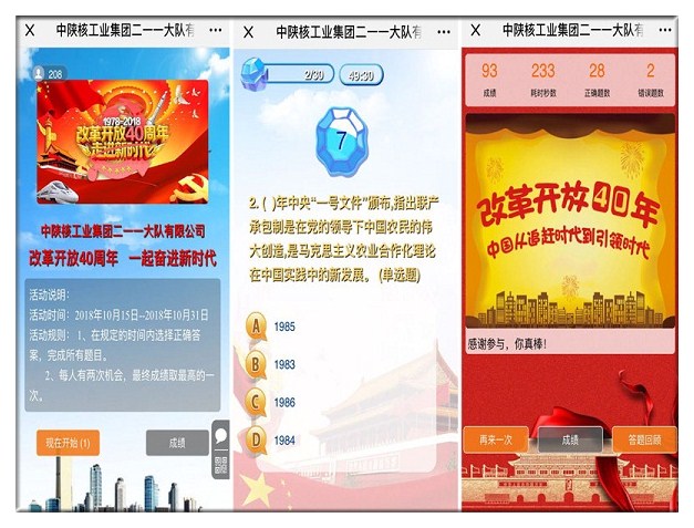 四是組織開展慶祝改革開放40周年在線知識競賽活動。為進(jìn)一步鞏固學(xué)習(xí)效果,在公司微信公眾號特開設(shè)“我要答題”知識競賽欄目,圍繞改革開放40周年的歷史和黨的十九大關(guān)于深化改革的相關(guān)知識,組織全體黨員、入黨積極分子、共青團(tuán)員等積極參加答題活動。