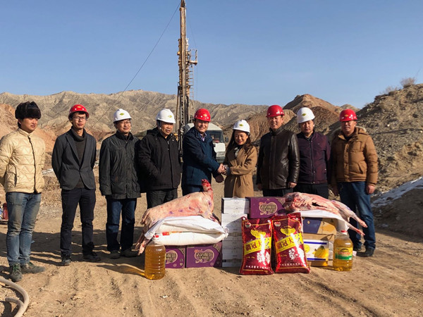 在大宛其鹽礦施工現(xiàn)場,李雅娟將羊肉、牛奶、大米、食用油等慰問品親自送到項(xiàng)目組,并參觀了員工宿舍、廚房,同項(xiàng)目成員進(jìn)行了親切的交談,詢問了他們的工作、生活等情況,叮囑在場人員一定要做好冬季施工安全防護(hù)和保暖措施,確保安全生產(chǎn)。