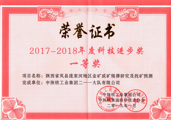 2019年1月17日,中陜核工業(yè)集團(tuán)公司“第三屆科技大會(huì)暨科協(xié)一屆二次會(huì)議”勝利召開。大會(huì)表彰了過去兩年集團(tuán)科技工作中涌現(xiàn)出的先進(jìn)集體和個(gè)人,我公司憑借《龐家河地區(qū)金成礦規(guī)律與成礦預(yù)測研究》科研項(xiàng)目取得的突出成果,獲得了“2017—2018年度科技進(jìn)步獎(jiǎng)一等獎(jiǎng)”。