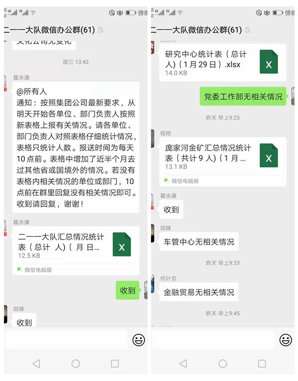 公司建立了實(shí)時(shí)通報(bào)機(jī)制,堅(jiān)持每日?qǐng)?bào)告制度,所屬各單位、本部各部門(mén)通過(guò)微信群逐一準(zhǔn)確統(tǒng)計(jì)所有員工每日外出情況和身體狀況,有事報(bào)情況,無(wú)事報(bào)平安,不瞞報(bào)、緩報(bào)、謊報(bào)。并將每日統(tǒng)計(jì)情況及時(shí)向陜西省委軍民融合辦和航天建設(shè)報(bào)告,確保個(gè)人、家人及他人不受疾病感染,健康平安。