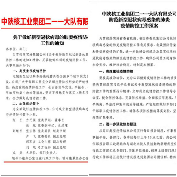加強(qiáng)防控組織領(lǐng)導(dǎo)。公司下發(fā)《關(guān)于做好新型冠狀病毒感染的肺炎疫情防控工作的通知》和《防范新型冠狀病毒感染的肺炎疫情防控工作預(yù)案》,成立了疫情防控工作領(lǐng)導(dǎo)小組,同時(shí)成立了由公司黨委班子成員帶班的疫情防控后勤保障突擊隊(duì),堅(jiān)決扛起防疫責(zé)任,奮戰(zhàn)在防疫一線。公司所屬獨(dú)立法人全資子公司或控股公司復(fù)工復(fù)產(chǎn)前成立由法人代表牽頭的疫情防控領(lǐng)導(dǎo)小組,結(jié)合自身情況和職工留居狀況,制定復(fù)工復(fù)產(chǎn)疫情防控工作方案和應(yīng)急預(yù)案,按照程序上報(bào)審批。