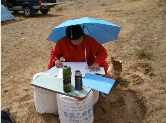 由于地形原因,只能輕裝上陣,很多辦公設(shè)備都沒有帶。大家急中生智,在袋子里面裝滿了沙子,上面放了個木板就成了我們的簡易辦公桌。夏日的太陽格外的毒,帳篷里面非常悶熱光線昏暗,我們就在露天辦公,太陽光太刺眼,我們就打把傘遮一下,繼續(xù)工作。就在這種艱苦的情況下,同志們沒有向困難低頭,堅持、不放棄,克服了一個又一個困難。