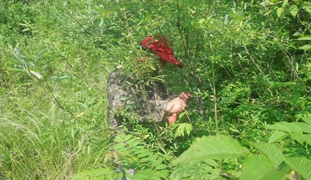 剛遷至鳳閣嶺后排村駐地時,正值4月中旬,坐在車上依然感受到山間微風帶來的陣陣清涼,仰望兩岸險峻的高山,心中不免有一絲絲的愜意。為完成第二階段對異常的查證工作,項目組齊心協(xié)力克服困難,在這陡峭的山崖上建立起一道亮麗的風景線:一個人在前面用地質錘挖出一個個供手腳著力的坑,后面的人像嬰兒一樣沿著同樣的軌跡爬行前進,好一幅手舞足蹈的畫面!原以為這會打擊隊員工作的積極性,可一位正擦拭額頭汗水的隊員滿懷信心的說:“我們要征服這里的每一座高山”。想想“會當凌絕頂”的感覺,我也頓時豪情萬丈,忘掉一切的恐懼和疲倦。