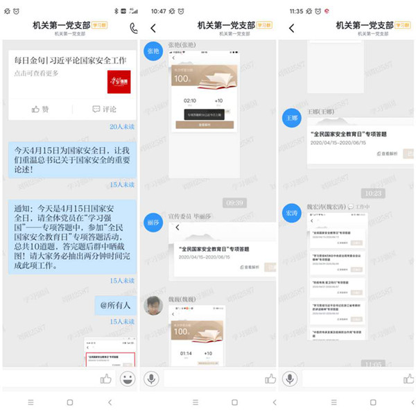 通知發(fā)出后,黨員紛紛響應(yīng),積極參與答題,分享答題截圖,并通過公司網(wǎng)站——法律法規(guī)專欄和微信公眾號(hào)——紀(jì)檢監(jiān)察專欄學(xué)習(xí)中華人民共和國憲法、國家安全法、網(wǎng)絡(luò)安全法等法律法規(guī)及國家安全教育知識(shí),進(jìn)一步樹立“國家利益高于一切,國家安全人人有責(zé)”的國家安全意識(shí)。