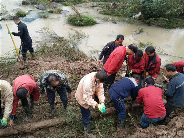 18日早,洪水水位降低,經(jīng)巡查發(fā)現(xiàn)尾礦回水管線部分管段被大水沖毀。運輸管線布設于河道邊側,一側是洪水,一側是滑坡。副總經(jīng)理老黨員張海宏帶領員工冒著危險進行了及時的搶修,讓選廠開機生產(chǎn)得以保障。