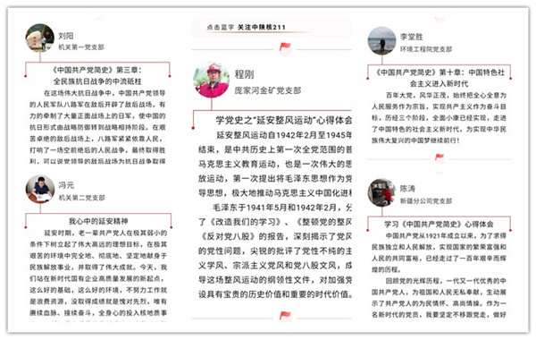 “談”心得體會。通過前期發(fā)放黨史書籍學(xué)、聽黨史故事學(xué)、誦紅色經(jīng)典學(xué)、召開黨員大會學(xué)、上專題黨史黨課學(xué)以及黨委中心組引領(lǐng)學(xué)等方式,營造了學(xué)黨史的濃厚氛圍,為進一步展現(xiàn)大家的學(xué)習(xí)情況,公司領(lǐng)導(dǎo)班子率先帶頭圍繞習(xí)近平同志《論中國共產(chǎn)黨歷史》有關(guān)章節(jié),誦讀黨史談心得體會。各支部組織黨員圍繞《中國共產(chǎn)黨簡史》等黨史書籍,談心得體會。通過官微每周推送2~3篇,充分展現(xiàn)公司全體黨員學(xué)習(xí)黨史的精神風(fēng)貌,既方便大家相互借鑒相互學(xué)習(xí),又能調(diào)動大家學(xué)習(xí)黨史的積極性。