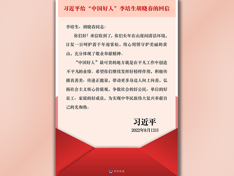 2008年起,中央文明辦組織開展網(wǎng)上“我推薦我評議身邊好人”活動,至今已發(fā)布“中國好人榜”150期,共有16228人(組)入選“中國好人”。李培生、胡曉春在黃山風(fēng)景區(qū)分別從事環(huán)衛(wèi)保潔和迎客松守護(hù)工作,2012年和2021年先后入選敬業(yè)奉獻(xiàn)類“中國好人”。近日,李培生、胡曉春給習(xí)近平總書記寫信,匯報工作情況和心得體會,表達(dá)了為守護(hù)美麗黃山、建設(shè)美麗中國貢獻(xiàn)力量的決心。