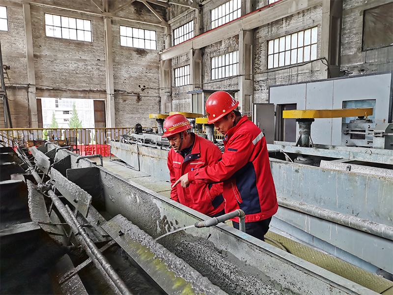 緊挨尾礦充填項目工地的就是公司的核心部門之一選廠。礦山企業(yè)如何將一塊塊礦石變成金燦燦的金精粉就得經(jīng)過它的巧手。球磨機的轟隆聲中,浮選槽里的刮板在不停的翻轉(zhuǎn)。國慶假期里,選廠負責人濮國榮和各崗位的一線工作人員都在崗位堅守。