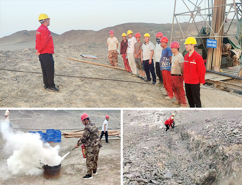 此次培訓(xùn)演練分為兩個(gè)環(huán)節(jié),演練前由項(xiàng)目經(jīng)理王磊講解了消防安全常識(shí)、火災(zāi)預(yù)防措施,介紹了滅火器材的使用原理以及相關(guān)的注意事項(xiàng),并親自演練了滅火器的使用方法,要求鉆探施工隊(duì)嚴(yán)格按照有關(guān)規(guī)定,落實(shí)消防安全責(zé)任,做好各類防火巡查、檢查工作。隨后,項(xiàng)目組組織鉆探人員在水文孔巖心擺放場(chǎng)地進(jìn)行了實(shí)物操作模擬演練,全體項(xiàng)目成員親自體驗(yàn)了現(xiàn)場(chǎng)滅火的過程。面對(duì)熊熊燃燒的火堆,同事們表現(xiàn)的十分沉著,熟練地按照滅火的步驟和方法,將巖心箱燃起的濃煙大火成功的迅速撲滅,做到了冷靜沉著的面對(duì)突發(fā)現(xiàn)象,成功快速的撲滅大火的消防標(biāo)準(zhǔn)。項(xiàng)目組人員又開展槽探編錄防滾石砸傷等應(yīng)急演練活動(dòng),演練過程緊張有序、效果良好。