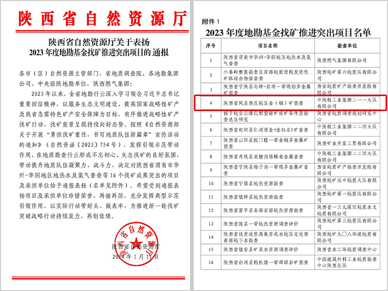 1月12日上午,陜西省自然資源廳組織召開新一輪找礦突破戰(zhàn)略行動暨2023年地勘基金項(xiàng)目成果交流研討會。二一一大隊(duì)有限公司組織實(shí)施的“陜西省鳳縣西莊金(銅)礦預(yù)查”項(xiàng)目2023年度找礦成果突出,獲省自然資源廳通報表揚(yáng)。