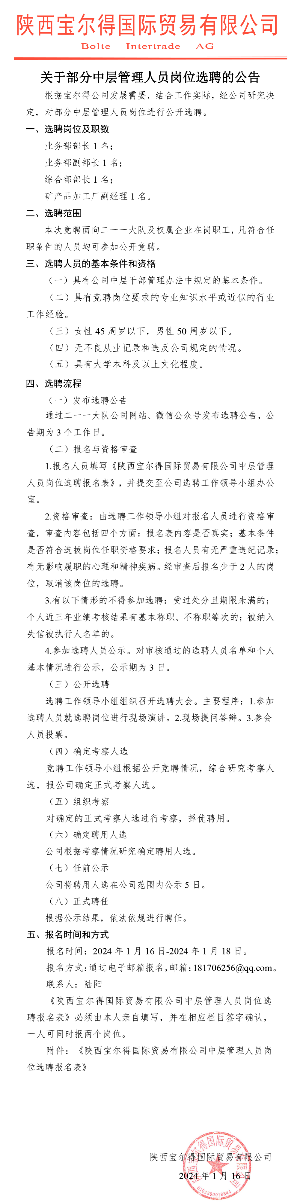寶爾得公司 | 關(guān)于部分中層管理人員崗位選聘的公告