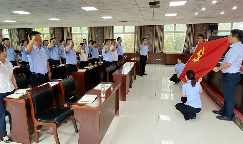 大會(huì)在雄壯的國(guó)歌聲中拉開帷幕。面向鮮紅的黨旗,全體黨員在劉旭的領(lǐng)誓下,高舉右拳,重溫入黨誓詞,宣示著黨員干部堅(jiān)定的理想信念和矢志不渝的奮斗決心。