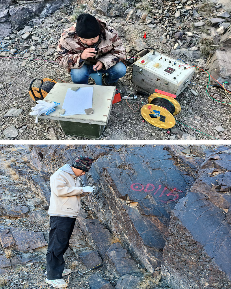 該項(xiàng)目地點(diǎn)位于木壘縣,屬中蒙邊界中低山區(qū),人煙稀少,通訊條件較差,歷年來(lái)在11月中旬都會(huì)大雪封山,導(dǎo)致項(xiàng)目面臨諸多困難。為了趕工期,搶時(shí)間,項(xiàng)目成員在黨員郭廣成的帶領(lǐng)下,不怕艱苦,不畏嚴(yán)寒,勇敢攀越,通過(guò)地形測(cè)量、地質(zhì)測(cè)量、水工環(huán)地質(zhì)調(diào)查、物探激電中梯掃面、物探激電測(cè)深測(cè)量、鉆探、槽探并輔以工程點(diǎn)測(cè)量等綜合勘查方法扎實(shí)開(kāi)展工作。截至目前,已完成實(shí)物工作量:地形測(cè)量3.8km2、地質(zhì)測(cè)量0.56km2、水工環(huán)地質(zhì)調(diào)查0.56km2、物探激電中梯掃面0.44km2、物探激電測(cè)深測(cè)量16點(diǎn),機(jī)械巖心鉆探5個(gè)孔共計(jì)458.50m、鉆孔編錄458.50m、槽探編錄196m、工程點(diǎn)測(cè)量22個(gè)。