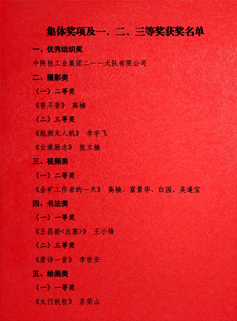 捷報(bào)傳來!中陜核工業(yè)集團(tuán)2024年新媒體文化作品大賽評選結(jié)果正式揭曉,二一一隊(duì)再度榮獲“優(yōu)秀組織獎(jiǎng)”,20名職工斬獲攝影類、視頻類、書法類、繪畫類等多項(xiàng)榮譽(yù),公司企業(yè)文化建設(shè)再上新臺階。