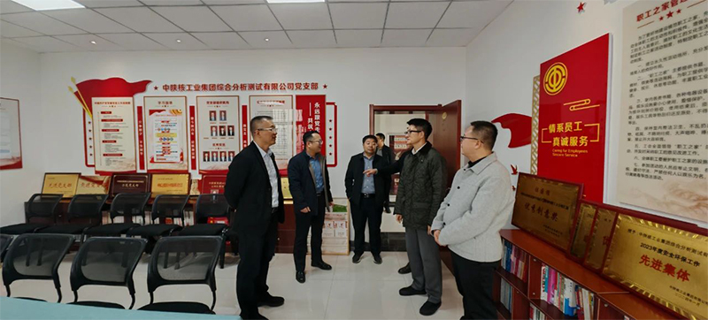范明一行深入測試公司生產(chǎn)一線,實地查看了樣品庫房、制樣車間和檢測實驗室,重點了解了鈾頁巖礦注浸工藝實驗流程及陜西省核與輻射應(yīng)急救援隊庫房的運行現(xiàn)狀。