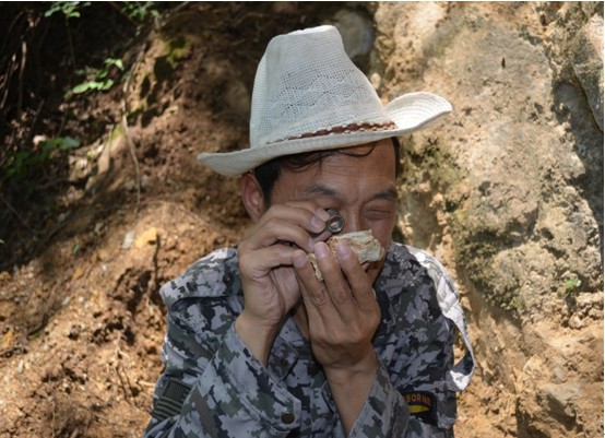 歷經兩個多小時崎嶇的山路,我們終于到了目的地。楊隊長顧不上休息,立即勤敲細打,仔細研究起來,從遠看到近看,再從近看到遠看、拿著巖礦石標本頭頂烈日聚精會神的觀察、仔細的查看著每一處蛛絲馬跡,項目負責肖強在一旁詳細地介紹著該地區(qū)地質情況以及工作情況。通過仔細觀察研究,楊隊長總結了該地區(qū)的地質特征,提出了許多非常寶貴的建議,并對下一步工作進行了指導。